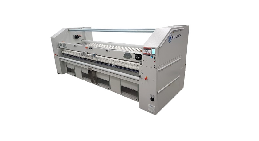 1. Un Opérateur de chargement est installé au centre de l'engageuse tandis qu'un opérateur place un coin de linge dans les deux pinces d'écartement. Les oubces d'écartement tendent le linge et reviennent ensuite vers l'opérateur.